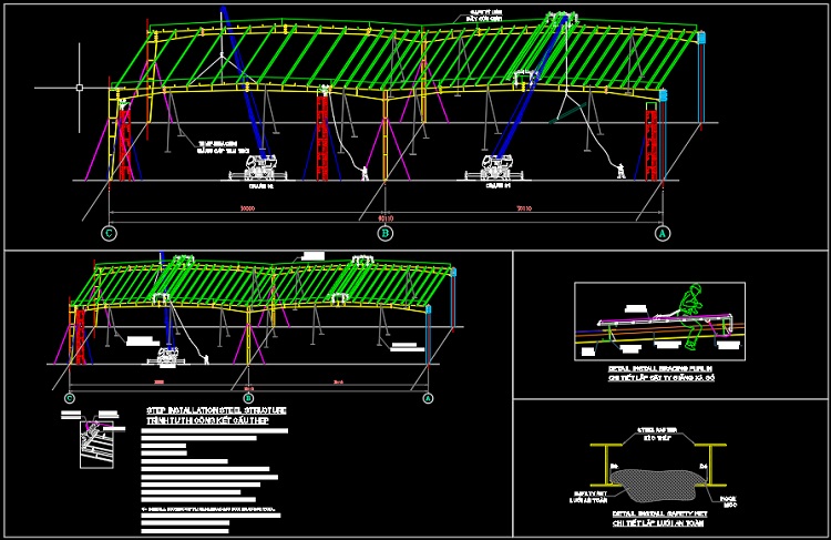 - Lắp xà gồ và cáp giằng: Làm cho khung thép ổn định hơn và giữ cho tấm lợp không bị rơi bằng cách gắn chúng vào mặt phẳng khung bên ngoài.