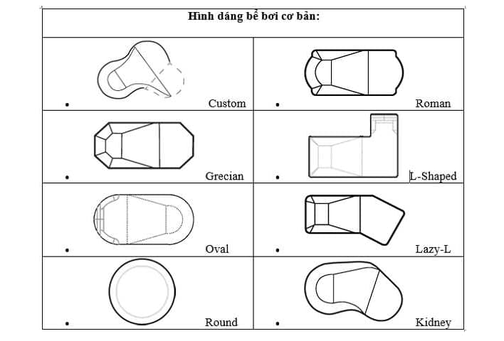 8 mẫu thiết kiểu dáng hồ bơi gia đình hợp phong thủy và đảm bảo tính thẩm mỹ cao bạn có thể tham khảo ở hình dưới đây: